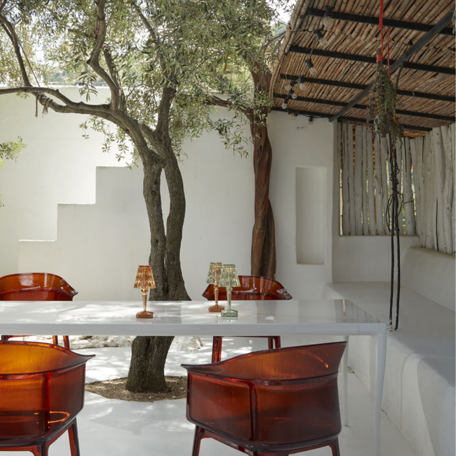 La table Albert 190 × 90 cm associe un large plateau à des pieds courbés caractéristiques de la collection. Elle combine des matériaux modernes pour offrir robustesse et longévité, tout en mettant en valeur les lignes iconiques du modèle.